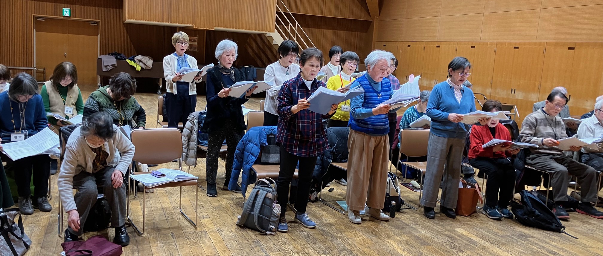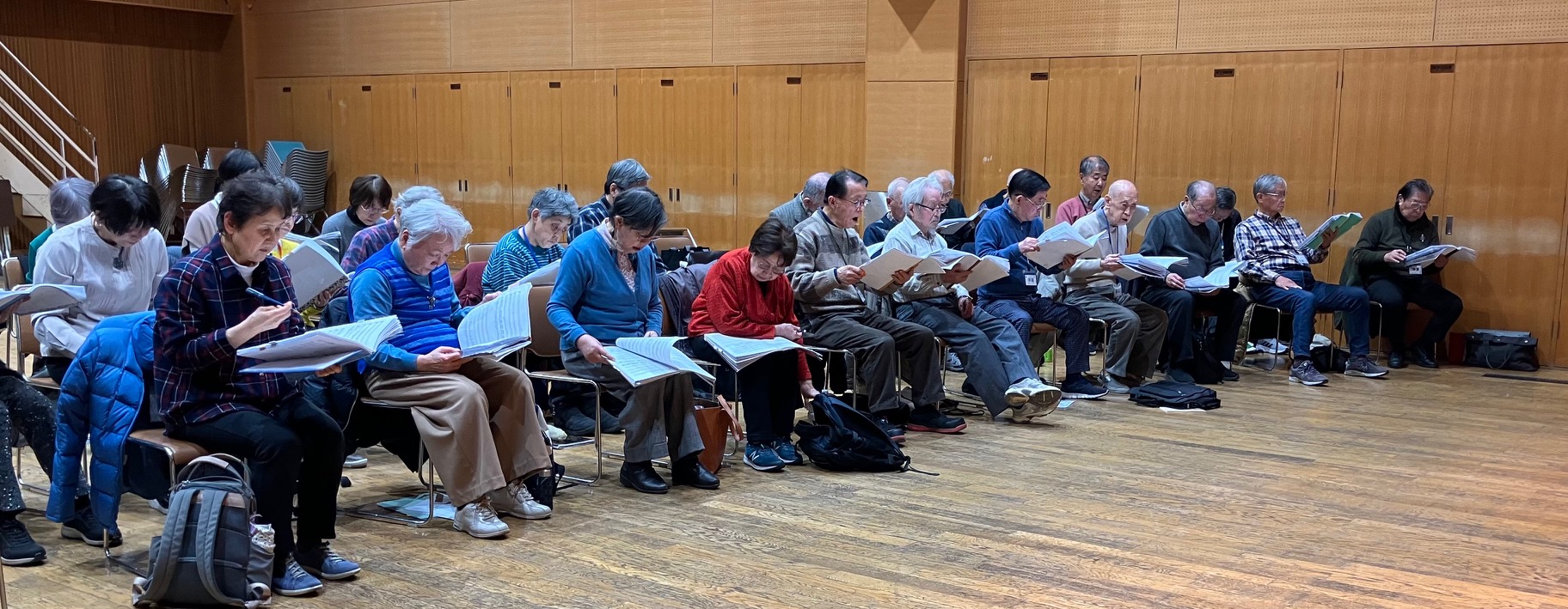 一説によると練混の平均年齢は73歳だそうですが、神藤さんから、猪村浩之先生の「歌声スマイル」がますます盛んになり、多い時には参加者が75人を
